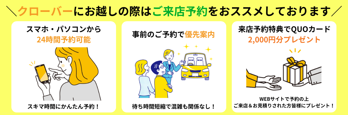 おクルマご購入のお申し込みをクローバーのプロスタッフへお気軽にご相談いただけます。 |